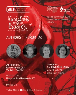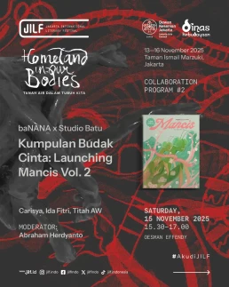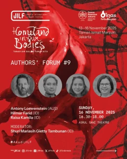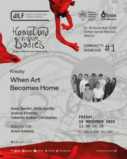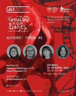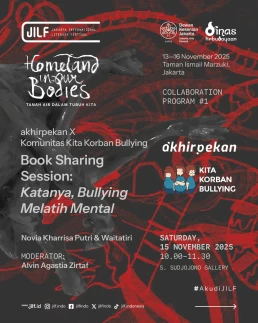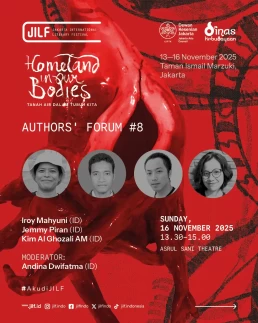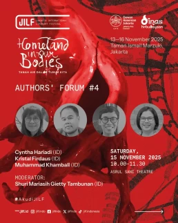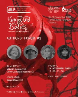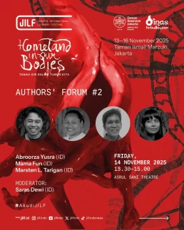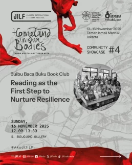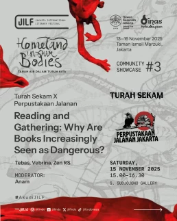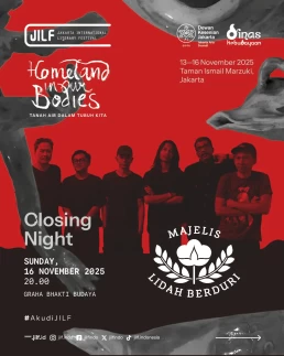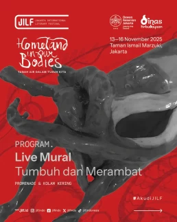 Day 1Day 2Day 3Day 4 Thursday13 November 2025 Music PerformanceBarasuaraThursday, 13 November 2025, 19.00Plaza Teater Jakarta, Taman Ismail Marzuki, Jakarta Friday14 November 2025 Authors' ForumBeyond Human NarrationFriday, 14 November 2025, 10.00‑11.30Asrul Sani Theatre, Taman Ismail Marzuki, Jakarta Community ShowcaseWhen Art Becomes HomeFriday, 14 November 2025, 13.00–14.30S. Sudjojono Gallery, Taman Ismail Marzuki Authors' ForumDefending Indigenous RightsFriday, 14 November 2025, 13.30–15.00 Asrul Sani Theatre, Taman Ismail Marzuki, Jakarta Community ShowcaseSmaller Space, Sharper LensFriday, 14 November 2025, 15.00–16.30 S. Sudjojono Gallery, Taman Ismail Marzuki Authors' ForumThere’s a Palestine Inside All of UsFriday, 14 November 2025, 16.30–18.00Asrul Sani Theatre, Taman Ismail Marzuki All Day BazaarJILF X patjarmerahFriday–Sunday, 14–16 November 2025, 10.00–21.30Emiria Soenassa Gallery, Taman Ismail Marzuki Live MuralTumbuh & MerambatFriday–Sunday, 14–16 November 2025, 10.00–21.30Promenade, Taman Ismail Marzuki Saturday15 November 2025 Authors' ForumEmbroidering the Homeland of EqualitySaturday, 15 November 2025, 10.00–11.30 Asrul Sani Theatre, Taman Ismail Marzuki, Jakarta Collaboration ProgramJust a Joke? Why Did It Leave Trauma?Saturday, 15 November 2025, 10.00-11.30S. Sudjojono Gallery, Taman Ismail Marzuki Authors' ForumVoice of the WitnessesSaturday, 15 November 2025, 13.30–15.00Asrul Sani Theatre, Taman Ismail Marzuki, Jakarta Community ShowcaseReading and Gathering: Why Are Books Seen as More Dangerous Now?Saturday, 15 November 2025, 15.00–16.30 S. Sudjojono Gallery, Taman Ismail Marzuki Authors' ForumAgainst Capitalism EntrappingSaturday, 15 November 2025, 16.30–18.00Asrul Sani Theatre, Taman Ismail Marzuki, Jakarta All Day BazaarJILF X patjarmerahFriday–Sunday, 14–16 November 2025, 10.00–21.30Emiria Soenassa Gallery, Taman Ismail Marzuki Live MuralTumbuh & MerambatFriday–Sunday, 14–16 November 2025, 10.00–21.30Promenade, Taman Ismail Marzuki Sunday16 November 2025 Authors' ForumAll Eyes on PapuaSunday, 16 November 2025, 10.00–11.30Asrul Sani Theatre, Taman Ismail Marzuki, Jakarta Community ShowcaseReading as the First Step to Nurture ResilienceSunday, 16 November 2025, 12.00–13.30S. Sudjojono Gallery, Taman Ismail Marzuki Authors' ForumBody of Working ClassSunday, 16 November 2025, 13.30–15.00Asrul Sani Theatre, Taman Ismail Marzuki, Jakarta Collaboration ProgramCircle of Love’s Devotees: Launch of Mancis Vol. 2Sunday, 16 November 2025, 15.30-17.00Oesman Effendi, Taman Ismail Marzuki Authors' ForumSolidarity: On Political TextSunday, 16 November 2025, 16.30–18.00Asrul Sani Theatre, Taman Ismail Marzuki, Jakarta Music PerformanceMajelis Lidah BerduriSunday, 16 November 2025, 20.00Graha Bhakti Budaya, Taman Ismail Marzuki All Day BazaarJILF X patjarmerahFriday–Sunday, 14–16 November 2025, 10.00–21.30Emiria Soenassa Gallery, Taman Ismail Marzuki Live MuralTumbuh & MerambatFriday–Sunday, 14–16 November 2025, 10.00–21.30Promenade, Taman Ismail Marzuki